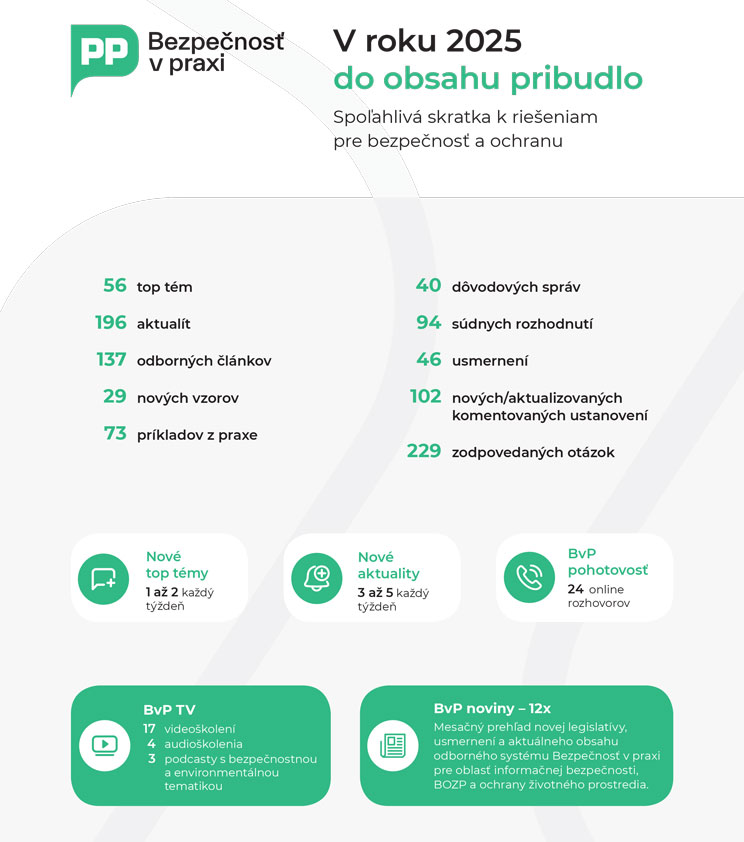 Zakúpením produktu získavate ročný prístup k celému obsahu s prepojením na súvisiace dokumenty a novelizovanú legislatívu, personalizovaným funkciám, videoškoleniam portálu www.bezpecnostvpraxi.sk.