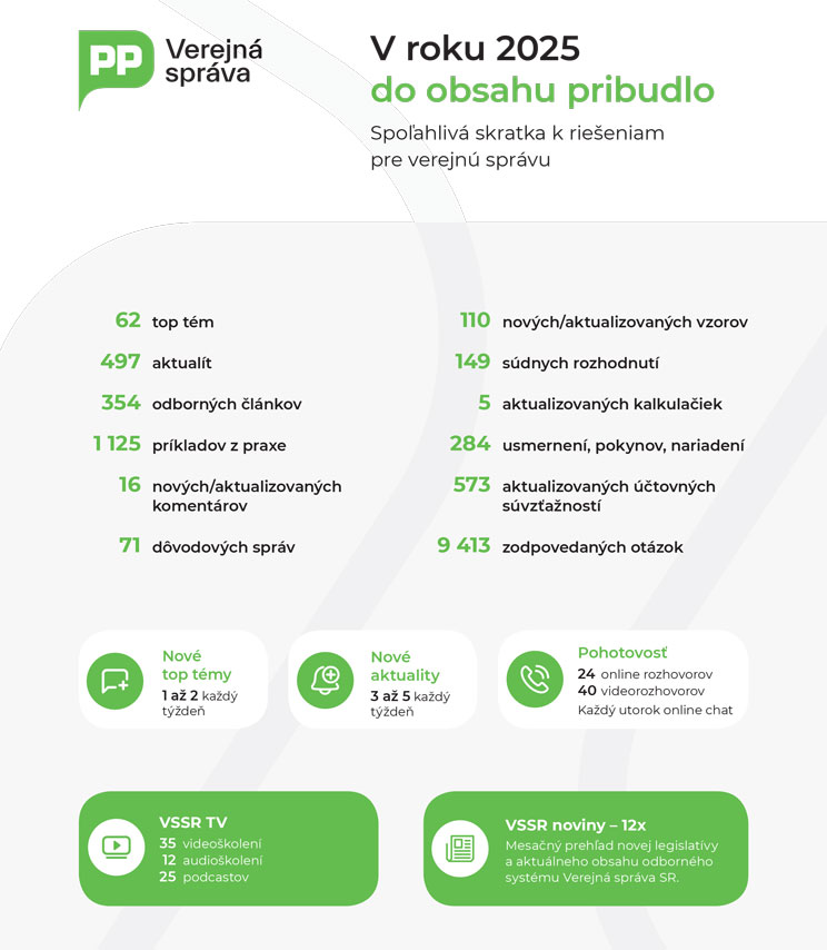Odborný online systém Verejná správa SR - sprievodca legislatívou, účtovníctvom, výkazníctvom a doplnkovými informáciami triedenými podľa subjektov verejnej správy Slovenskej republiky.